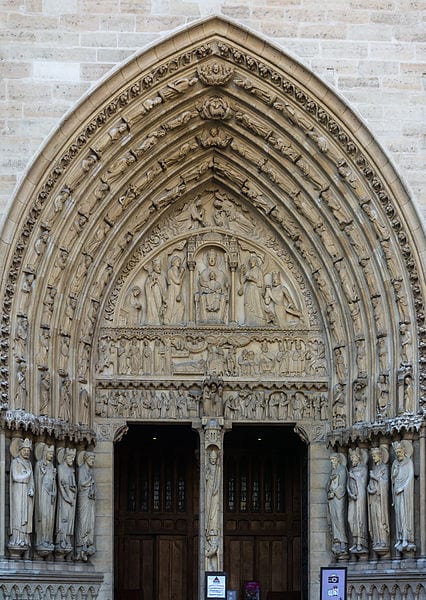 There is one entryway that stands out as different from the others on the cathedral’s western facade. That’s because the Sainte-Anne Portal was not originally designed for Notre Dame – it is from an earlier era and was actually recycled from a different Romanesque church.