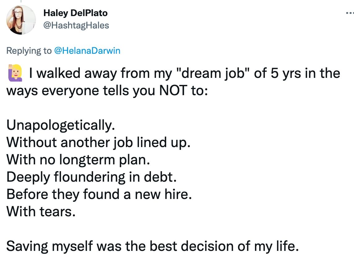 That said, sometimes we reach a breaking point where we have to choose our own health and happiness over the job security for one more day – and these 12 people who have been there promise it’s worth it on the other side.