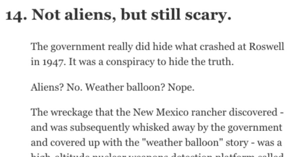 The government really did hide what crashed at Roswell in 1947. It was a conspiracy to hide the truth.