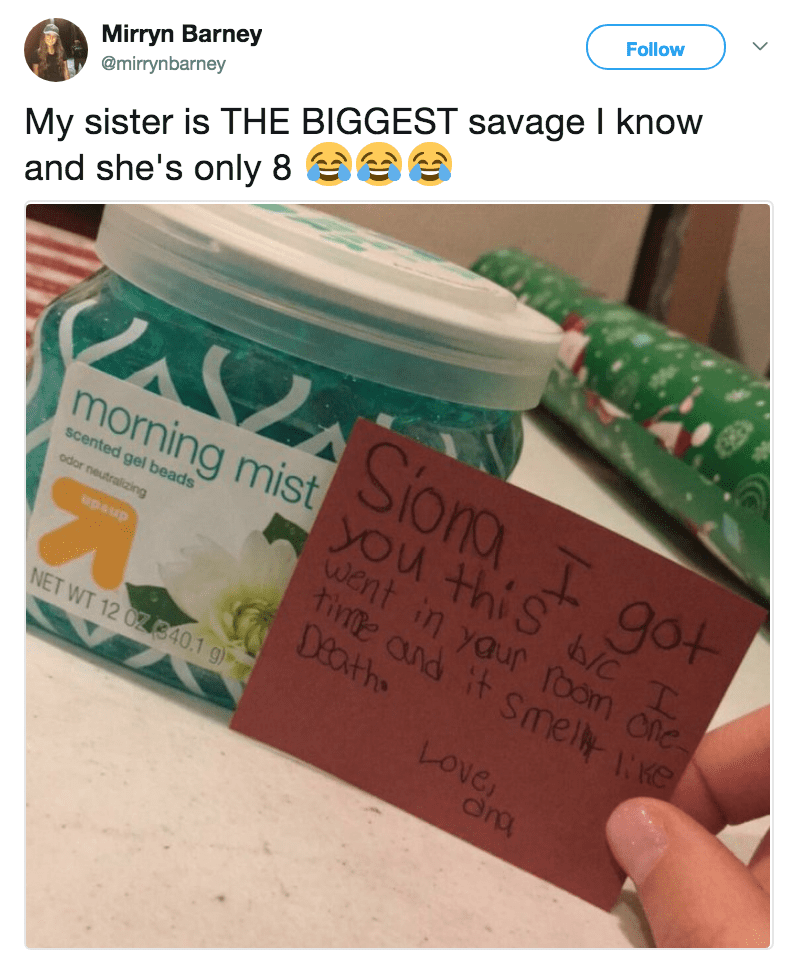 8. “My sister really made me a bow tie…OUT OF MY OWN HAIR. It’s time to move out”