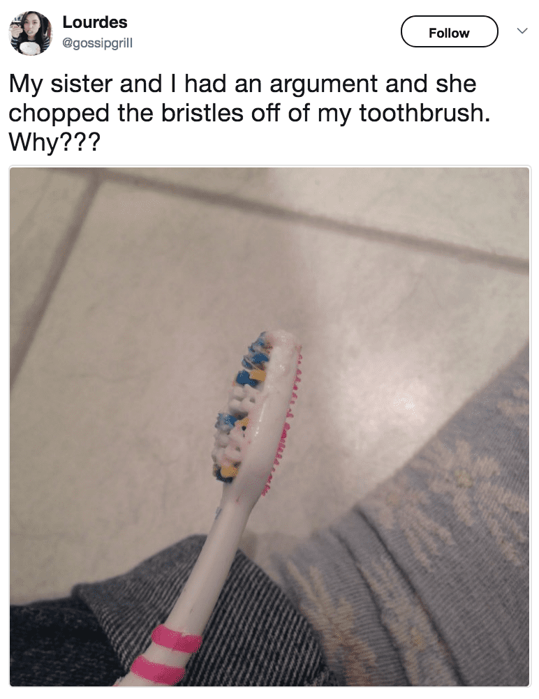 12. “My sister and I had an argument and she chopped the bristles off of my toothbrush. Why???”