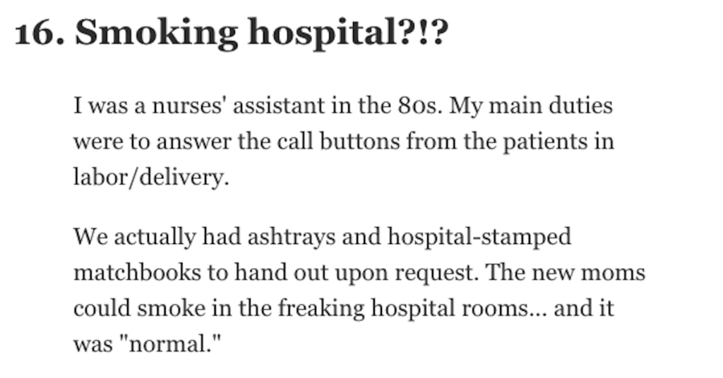 We actually had ashtrays and hospital-stamped matchbooks to hand out upon request. The new moms could smoke in the freaking hospital rooms… and it was “normal.”