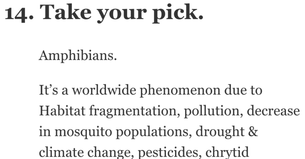 It’s a worldwide phenomenon due to Habitat fragmentation, pollution, decrease in mosquito populations, drought & climate change, pesticides, chytrid fungi…take your pick.