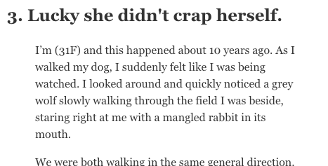 I’m (31F) and this happened about 10 years ago. As I walked my dog, I suddenly felt like I was being watched. I looked around and quickly noticed a grey wolf slowly walking through the field I was beside, staring right at me with a mangled rabbit in its mouth.