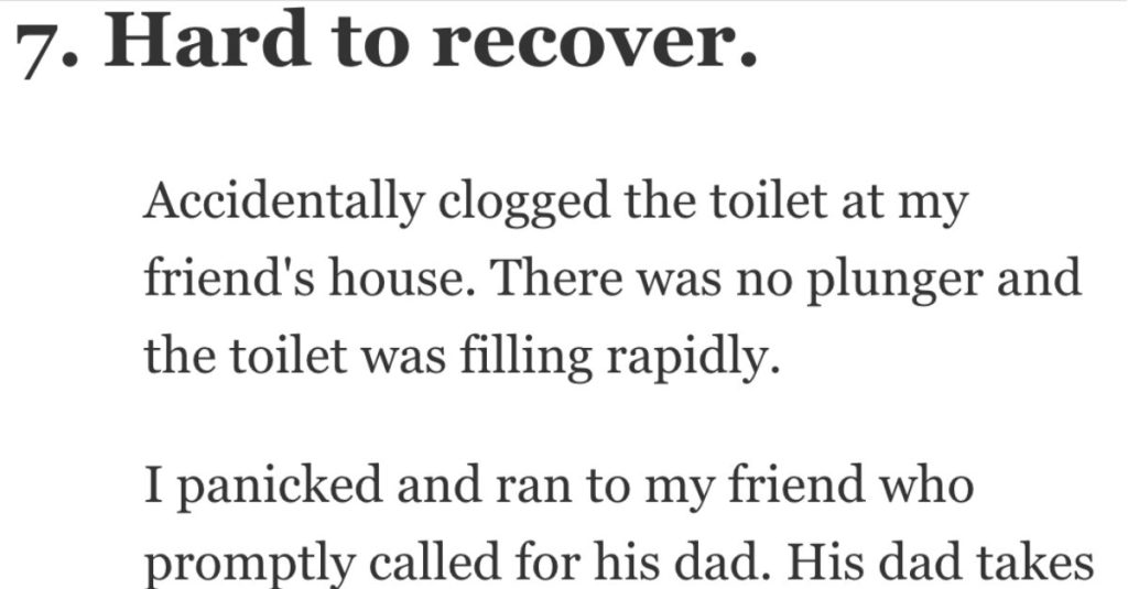 I panicked and ran to my friend who promptly called for his dad. His dad takes one look and yells from the bathroom, “Jesus, ‘X’! How big of a s*%t did you take?!”