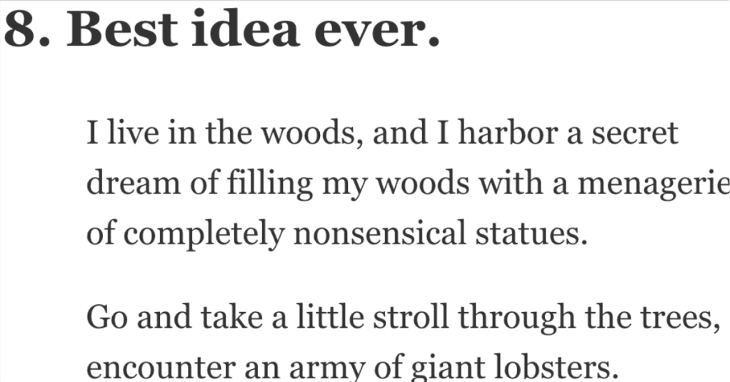 I live in the woods, and I harbor a secret dream of filling my woods with a menagerie of completely nonsensical statues.