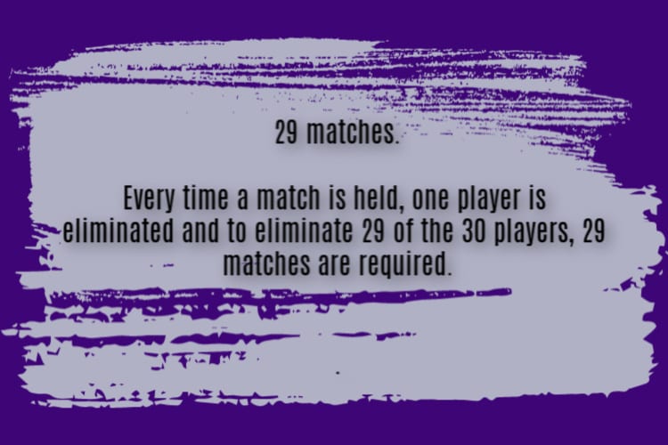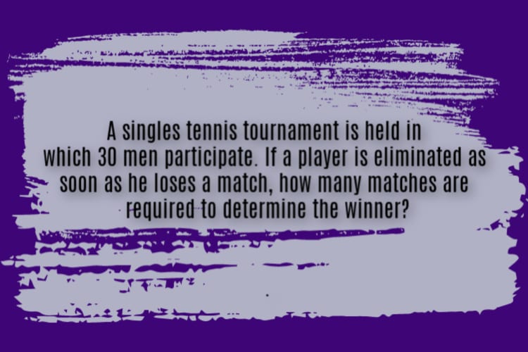 #5. A singles tennis tournament is held in which 30 men participate. If a player is eliminated as soon as he loses a match, how many matches are required to determine the winner?