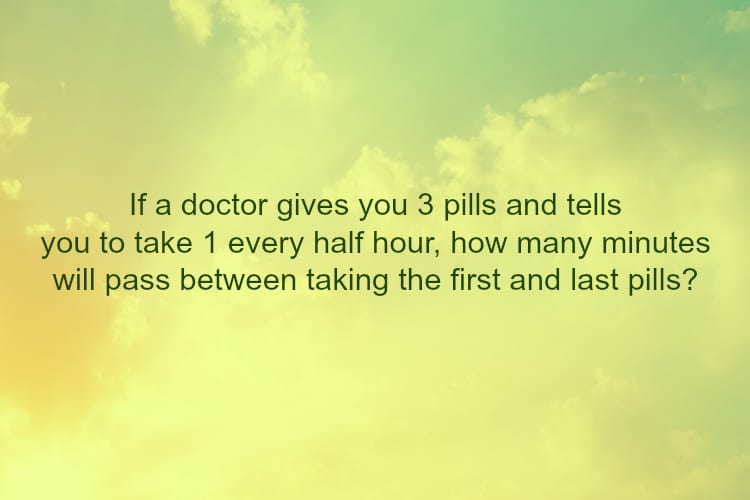 #1. If you get 3 pills and take 1 every half hour, how many minutes pass between the first and the last?