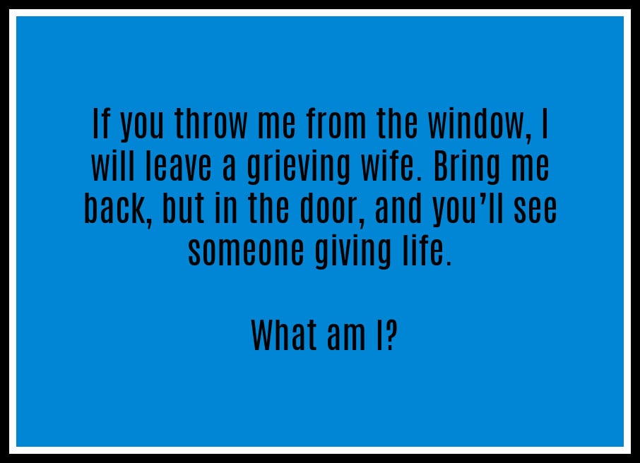 4. If you throw me from the window, I will leave a grieving wife. Bring me back, but in the door, and you’ll see someone giving life. What am I?