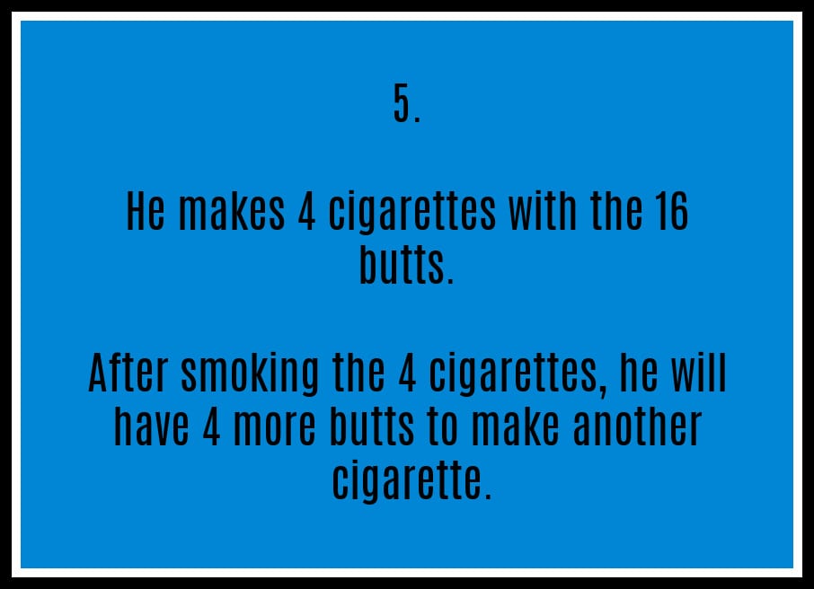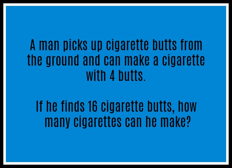 3. A man picks up cigarette butts from the ground and can make a cigarette with 4 butts. If he finds 16 cigarette butts, how many cigarettes can he make?