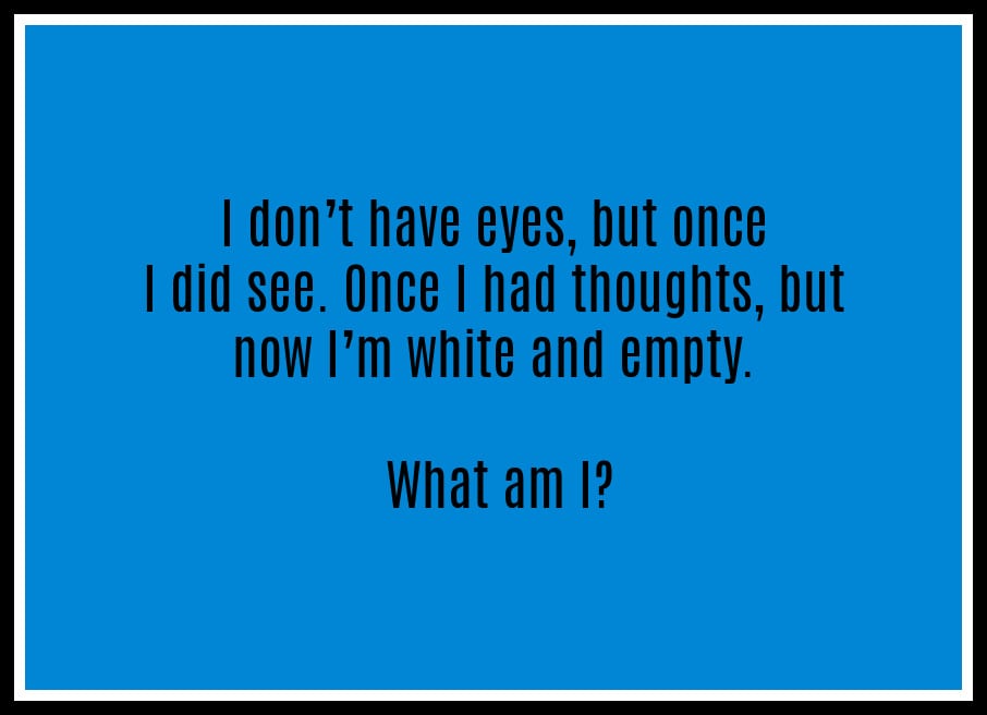 6. I don’t have eyes, but once I did see. Once I had thoughts, but now I’m white and empty. What am I?