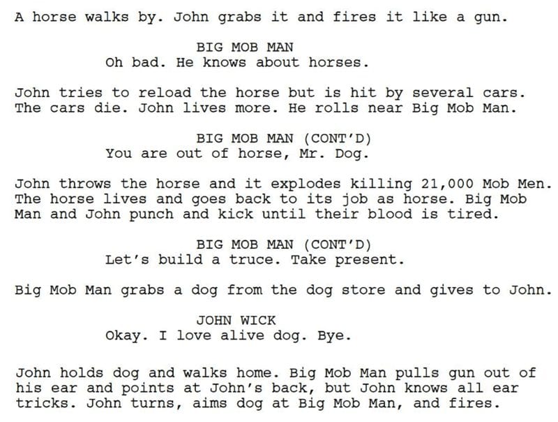 This time, Patti forced a bot to watch more than 1,000 hours of John Wick footage (I’m assuming just the two available films on an endless loop) and then a new, original screenplay emerged.