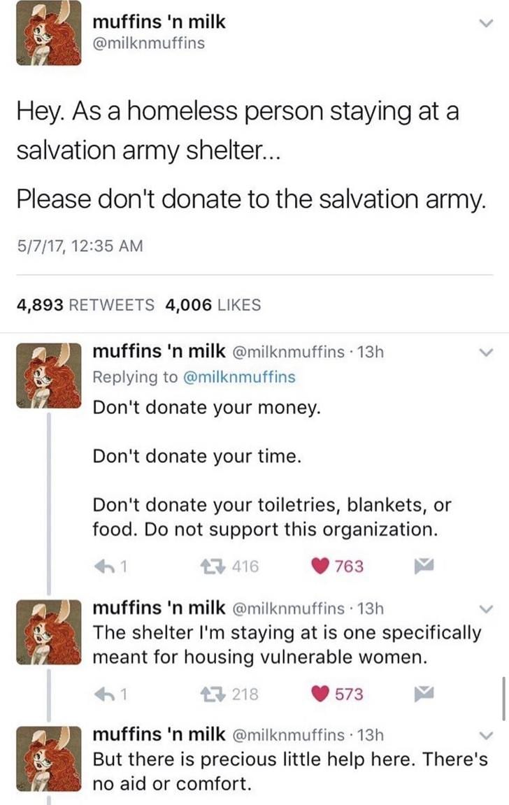 A woman who has been in need of shelter on occasion, and who has stayed in a women’s shelter owned by the Salvation Army, details a litany of complaints on Twitter.