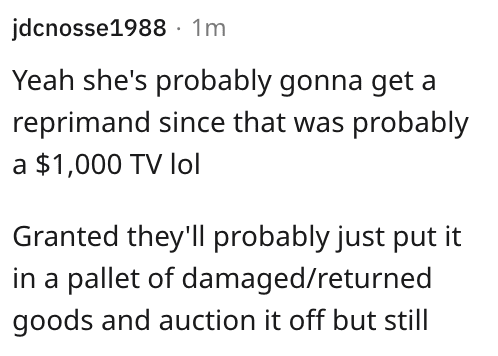 Karen is beet red with her forehead veins popping out and throbbing at this point. Lovely check out gal interjects to the store manager: “Sorry I didn’t notice the TV on the conveyor belt as I was helping the elderly customer ahead arrange her shopping cart. We only have ourselves to blame as we’ve been telling everyone all morning that all items must be on the belt”.