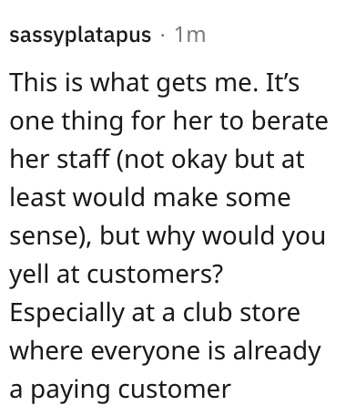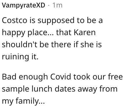 And lastly, this reader had a good point: Costco is supposed to be enjoyable for all of this and this woman is definitely ruining it!