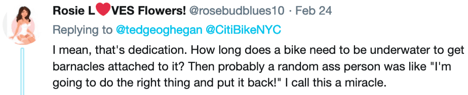 Records show the bike was last rented in September 2017, so it’s possible it spent 15 months underwater. But the mystery remains because no one knows how the bike resurfaced and ended up back on a dock.