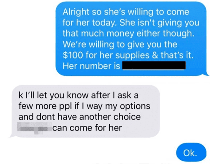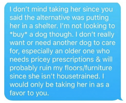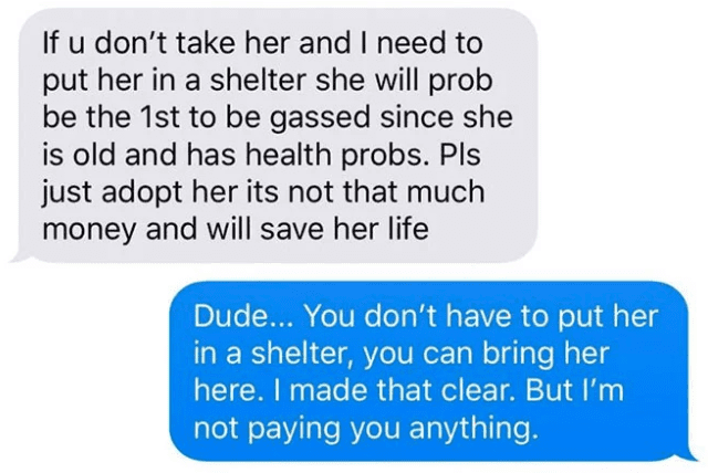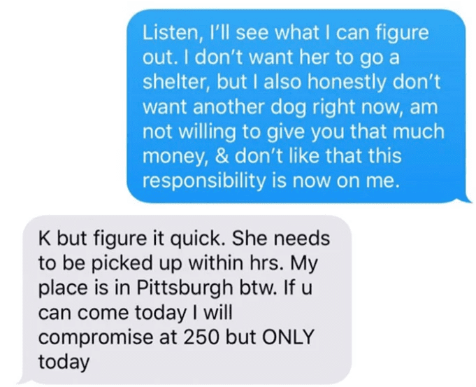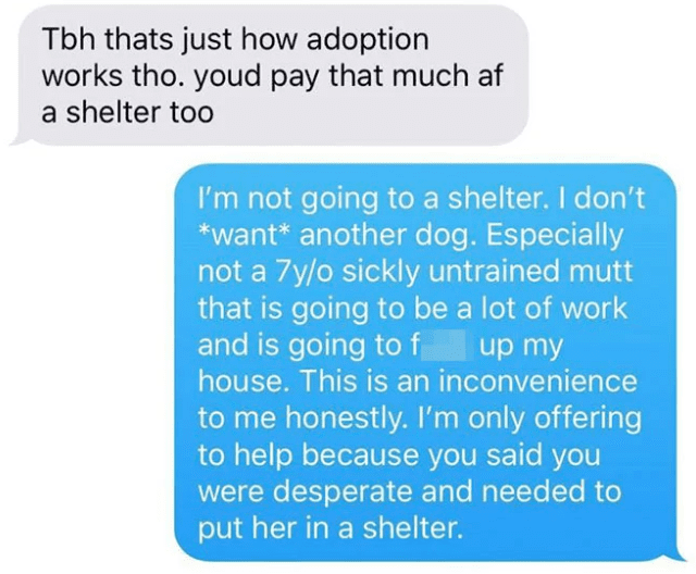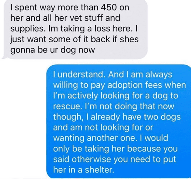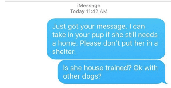 A woman exchanged texts with someone who was desperately looking to get rid of her dog. She said the poor pooch was going to be euthanized if no one took her because she had to put her in a shelter.