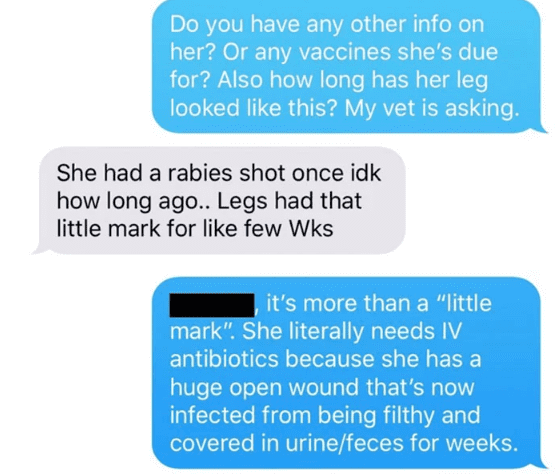 The woman and her cousin each agreed to put in $50 each for a total of $100 to get the dog out of what was obviously a terrible situation. They rescued the dog but then discovered signs of abuse and neglect. They brought her to a vet and tried to get the previous owner to send the dog’s medical records.