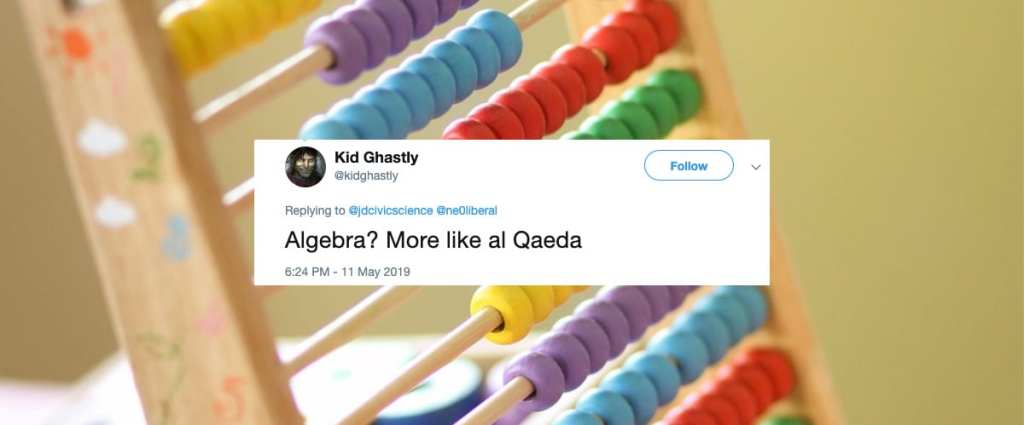 “Math was created by Muslims. And we teach this Islamic math to children. Math teachers are terrorists! Algebra? More like Al Jazeera… I will ban this Sharia math from being taught to American children. There will be no more math.”