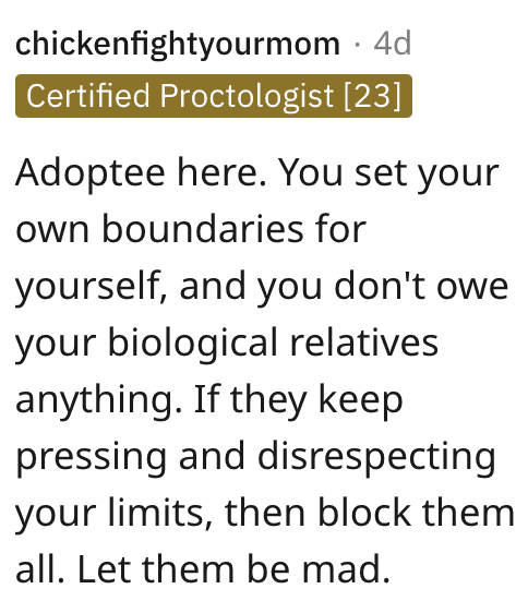 The bottom line is that OP doesn’t owe her biological family anything, and if they’re mad, she’s got to let them be mad.