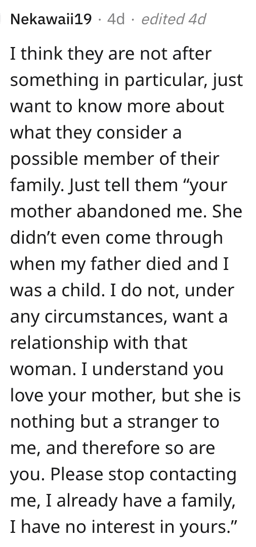 She’s not sure what they want but has declined a meeting, letting them know that she’s been through a lot to resolve her feelings about their mother and she’s not interested in wading back into the quagmire again.