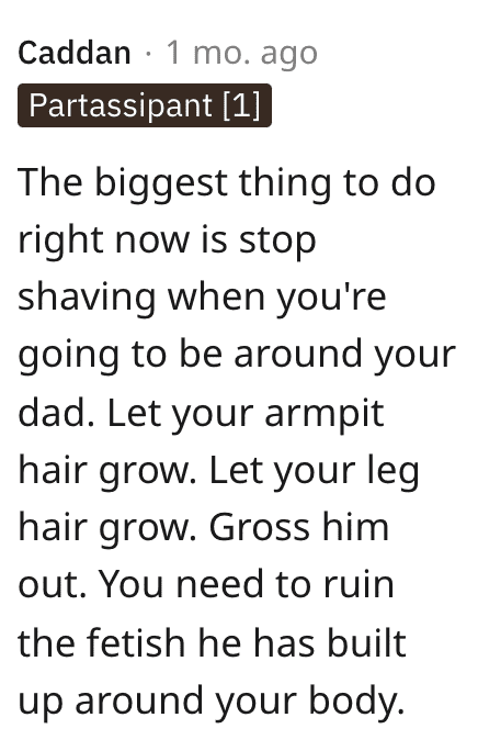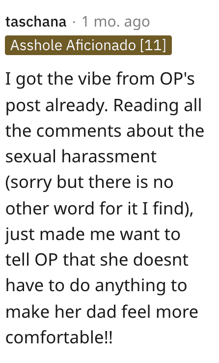 Many people feel OP should take it a step further and minimize contact, because it’s not her job to look attractive for anyone, and certainly not for her father.