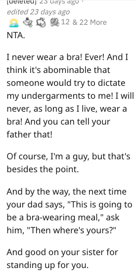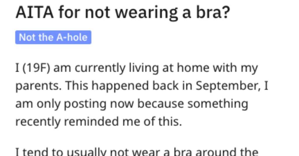 That’s what this OP is wondering after an incident at home. She came to dinner with her teenage sister and parents without a bra, and her father made a comment about her needing to put one on before they could eat dinner.