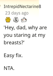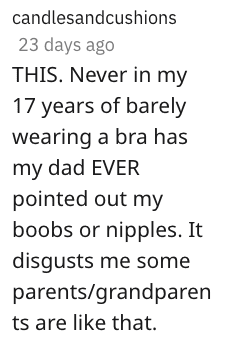 The incident in question happened when my parents called me and my sister (17F) to eat dinner. I was not wearing a bra, as per usual, and my dad made some comment like “This is going to be a bra-wearing meal.” I thought it was a joke, kind of, so I just kind of said nothing, and obviously didn’t go to put a bra on.