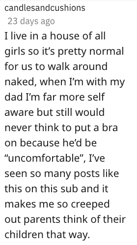 Then my dad got really quiet and said that it “makes him uncomfortable” when we don’t wear bras, and he just kind of left the room. He eventually came back to eat dinner with us, but he didn’t say a word the entire time.