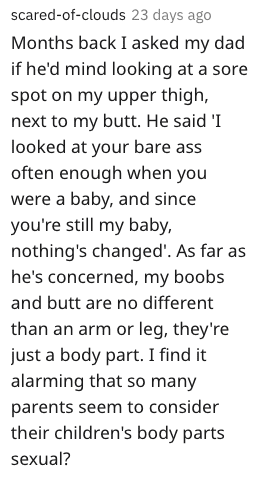And again, recently, he made some comment about how what I was wearing (a t-shirt with no bra and shorts) made him uncomfortable, and he got mad again and wouldn’t talk to anyone.