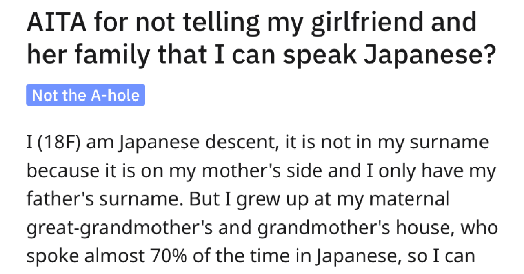 That’s the argument this woman found herself in with her girlfriend after it was revealed a few months into their relationship that she could understand her girlfriend’s family speaking Japanese the entire time.