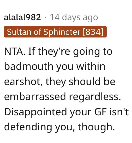 They got into a bit of a thing about whether or not the girlfriend really did her best to stand up for OP in those moments, and OP is wondering whether she should have said something after all.