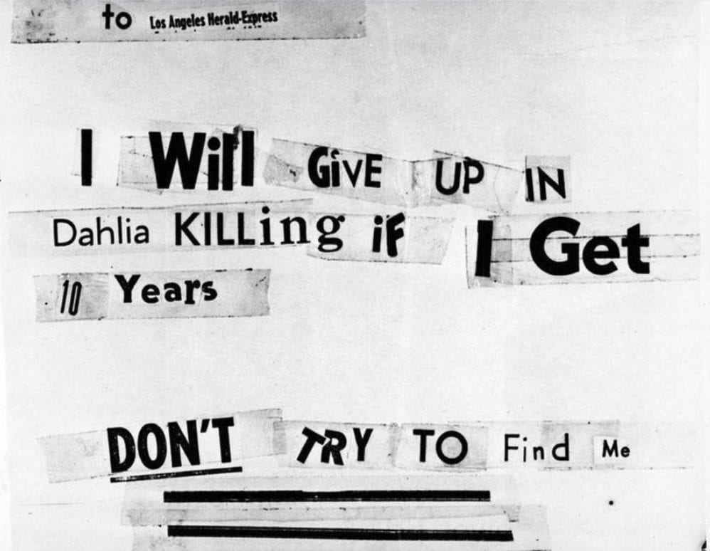 Nine days after Short’s body was found, a large manila envelope was discovered by a postal worker, addressed to “The Los Angeles Examiner and other Los Angeles papers.” Inside the envelope were Short’s birth certificate and other items. The package was cleaned with gasoline to erase all fingerprints. Short’s handbag and one of her shoes were found in an alley two miles from the body dump site, also cleaned with gasoline. Another envelope, this one containing a letter, was discovered on January 26. It told police that the killer would turn himself in on a certain day and time. The man never showed, instead sending yet another letter, which read, “Have changed my mind. You would not give me a square deal. Dahlia killing was justified.”
