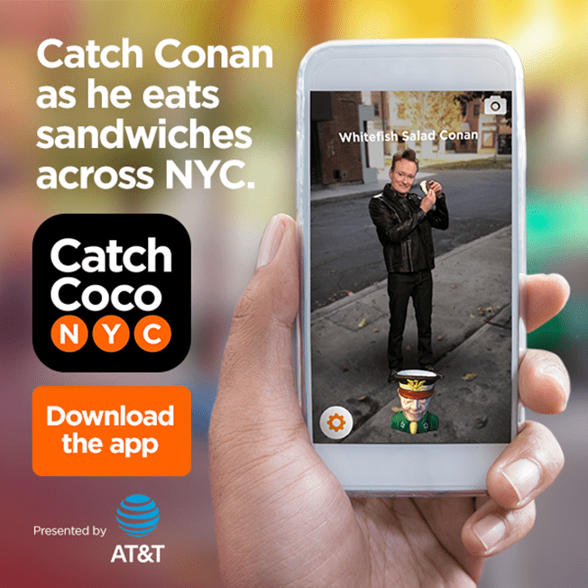 To coincide with the talk show host’s week-long stint at Harlem’s Apollo Theater, the Conan show released an app called “Catch Coco” on iOS and Android, where you can search NYC for AR (“augmented reality”) versions of Conan eating 15 different sandwiches.