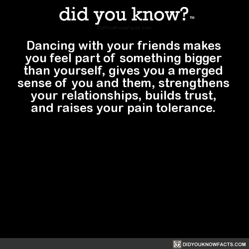 Dancing with your friends makes you feel part of something bigger than yourself, gives you a merged sense of you and them, strengthens your relationships, builds trust, and raises your pain tolerance.