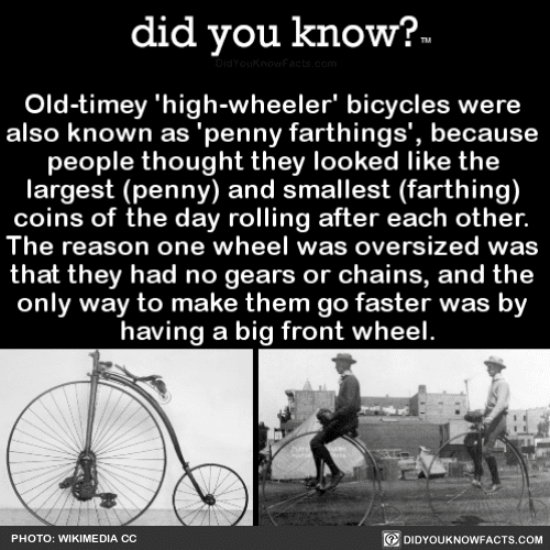 Old-timey ‘high-wheeler’ bicycles were also known as ‘penny farthings’, because people thought they looked like the largest (penny) and smallest (farthing) coins of the day rolling after each other. The reason one wheel was oversized was that they had no gears or chains, and the only way to make them go faster was by having a big front wheel. Source Source 2
