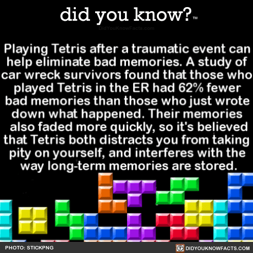 Playing Tetris after a traumatic event can help eliminate bad memories. A study of car wreck survivors found that those who played Tetris in the ER had 62% fewer bad memories than those who just wrote down what happened. Their memories also faded more quickly, so it’s believed that Tetris both distracts you from taking pity on yourself, and interferes with the way long-term memories are stored. Source Source 2