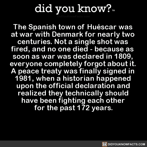 The Spanish town of Huéscar was at war with Denmark for nearly two centuries. Not a single shot was fired, and no one died – because as soon as war was declared in 1809, everyone completely forgot about it. A peace treaty was finally signed in 1981, when a historian happened upon the official declaration and realized they technically should have been fighting each other for the past 172 years. Source Source 2 Source 3