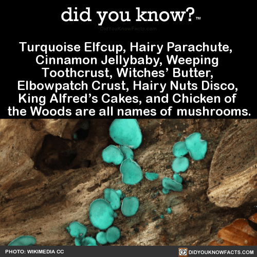 Turquoise Elfcup, Hairy Parachute, Cinnamon Jellybaby, Weeping Toothcrust, Witches’ Butter, Elbowpatch Crust, Hairy Nuts Disco, King Alfred’s Cakes, and Chicken of the Woods are all names of mushrooms.