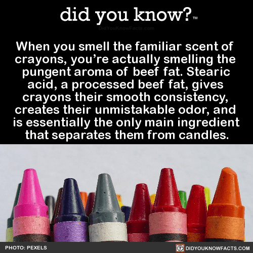 When you smell the familiar scent of crayons, you’re actually smelling the pungent aroma of beef fat. Stearic acid, a processed beef fat, gives crayons their smooth consistency, creates their unmistakable odor, and is essentially the only main ingredient that separates them from candles. Source Source 2 Source 3