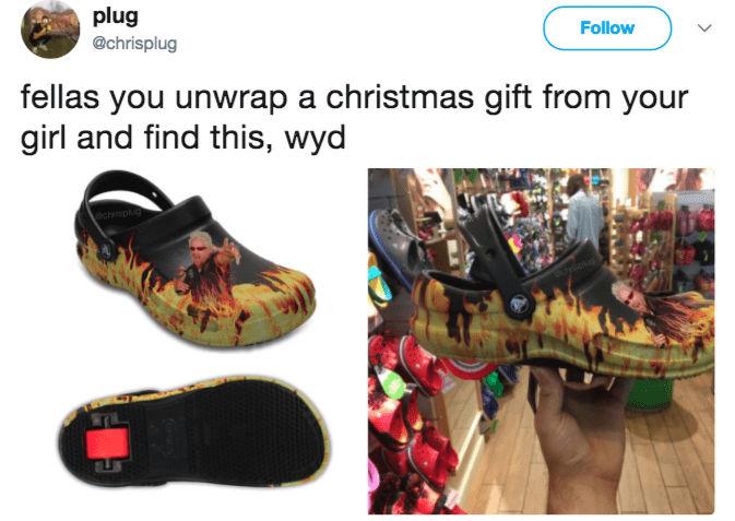 That’s right, those are Crocs emblazoned with the likeness of the one and only Guy Fieri, rock star chef. Oh, and the Crocs have flames. Lots of flames. Plug’s question got plenty of responses about what people would do if their girlfriend gave them such a horrendous gift.