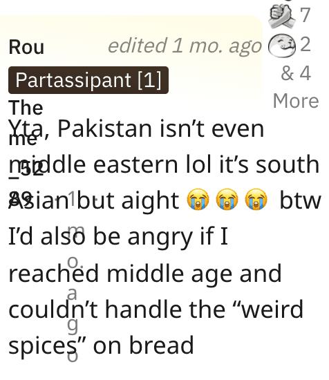 The top comment makes two good points – that Pakistan isn’t in the Middle East and also that most adults can handle a few bites of food that isn’t their favorite for the sake of manners.