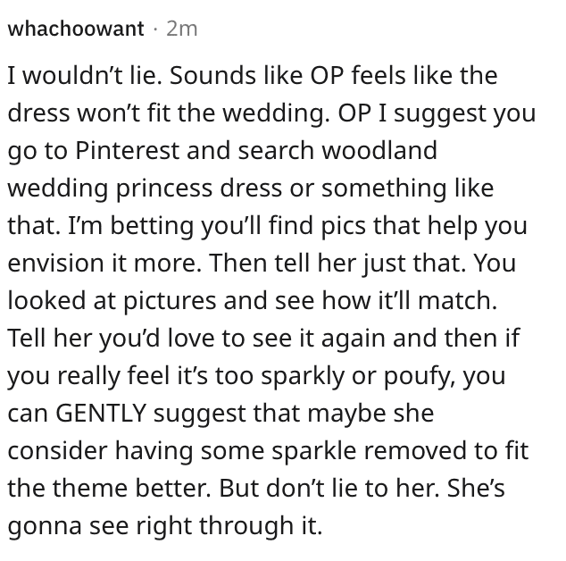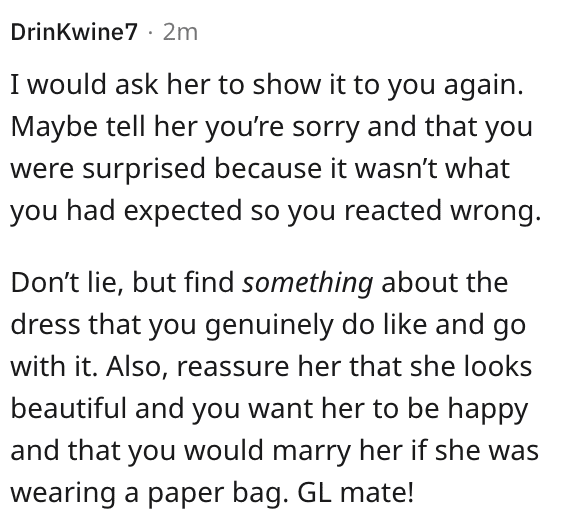 And this person also thinks that the man shouldn’t lie but that he needs to find something specific about what he likes about the dress to make her feel a little bit better.