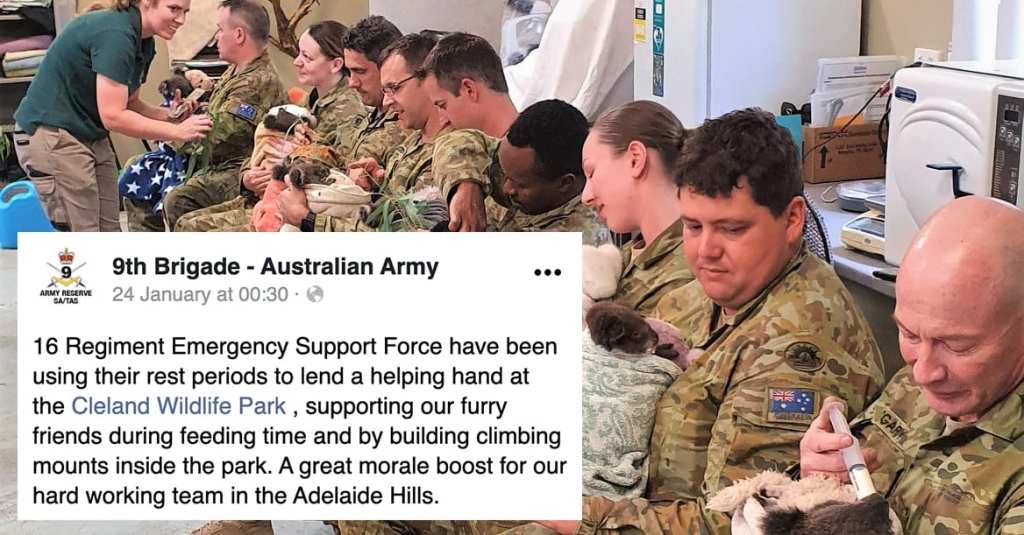 The men have assisted affected animals on-site at Cleland National Park. The 9th Brigade of the Australian Army posted pictures of these efforts on their official Facebook page, saying: