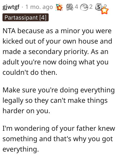 My dad left everything to me and not even a dime to her (they were not married), My dad’s will was so structured that she couldn’t challenge it, and she attempted and even ask me to pass over one of my properties to her to show my “new” dad that he was welcomed, I couldn’t even if I wanted to, because my dad’s will was specified that I must be 21 to have access to everything he left me.
