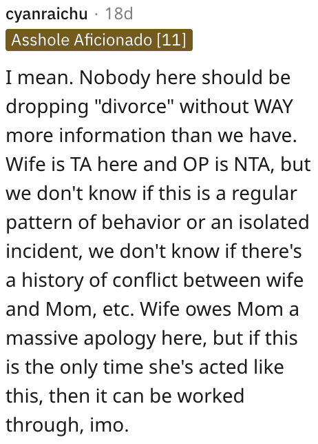 And another Reddit user said more information is needed, but the wife owes the man’s mother a big apology.