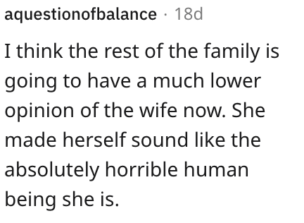Lastly, this reader said that the man’s wife is probably going to have to deal with her husband’s family having a low opinion of her now.
