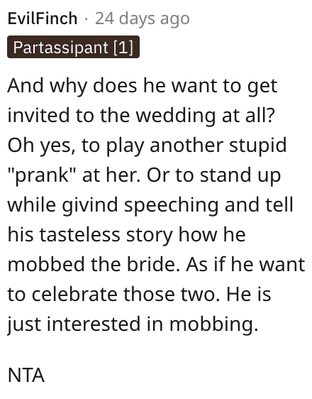 And another Reddit user brought up a good point: why does he even want to go to the wedding?