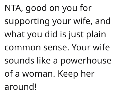 Another Reddit user also said he’s NTA and that he did the right thing by supporting his wife.
