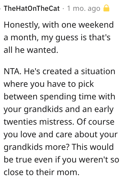 “My son (44M) divorced his wife (43F) after having an affair with a much younger woman (I think 23F). He and his ex have two kids (12, 6) and his ex has almost full custody of them.